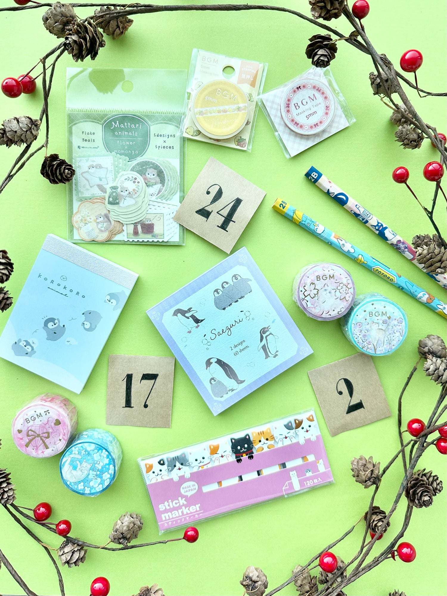 Vi har skrivesaker som fargeblyantsett, blyant, notatbok og linjal, til og med noen søte små Sumikko Gurashi bamser!