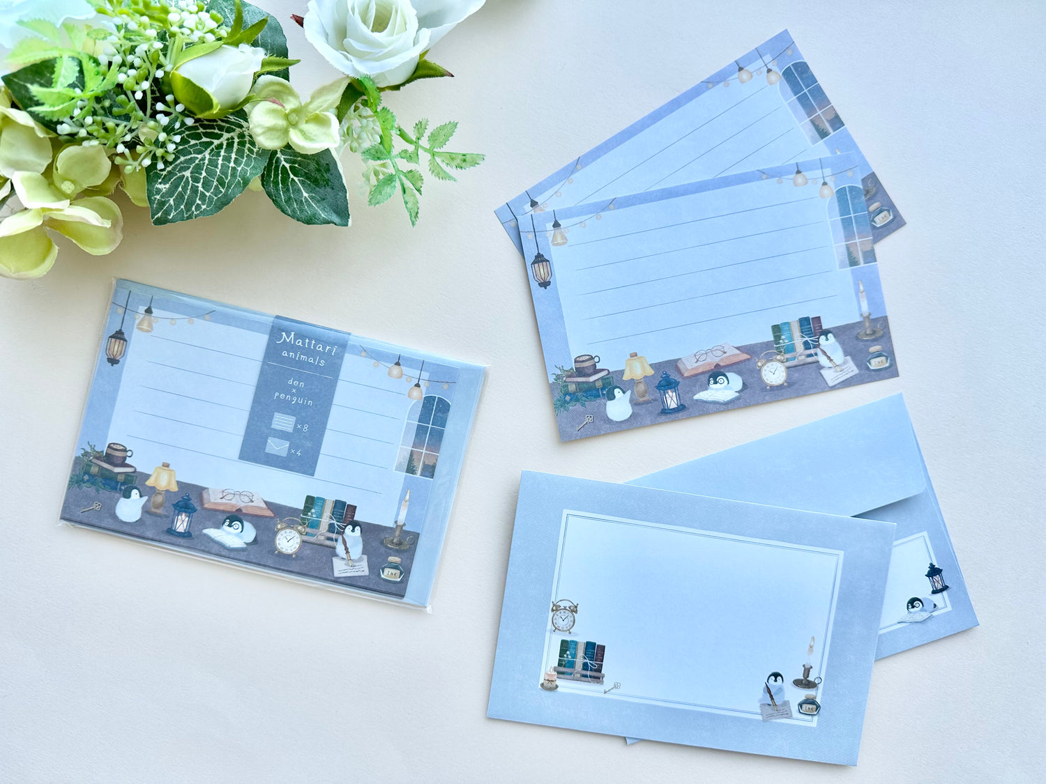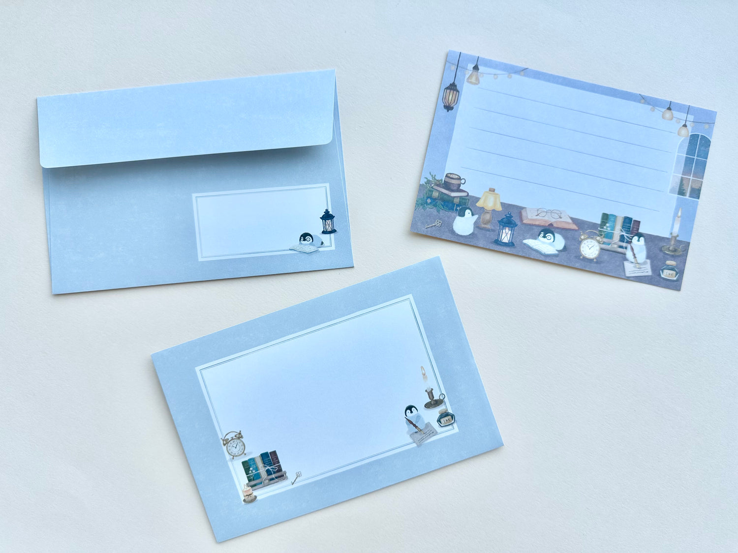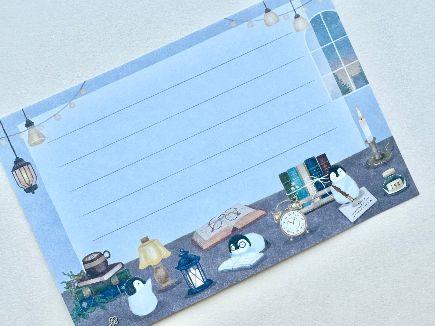 Brevsett med pingviner som nyter kvelden med tente lys og en rolig atmosfære.