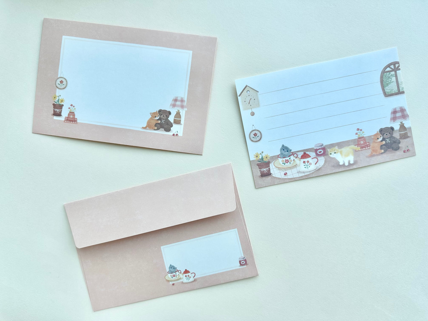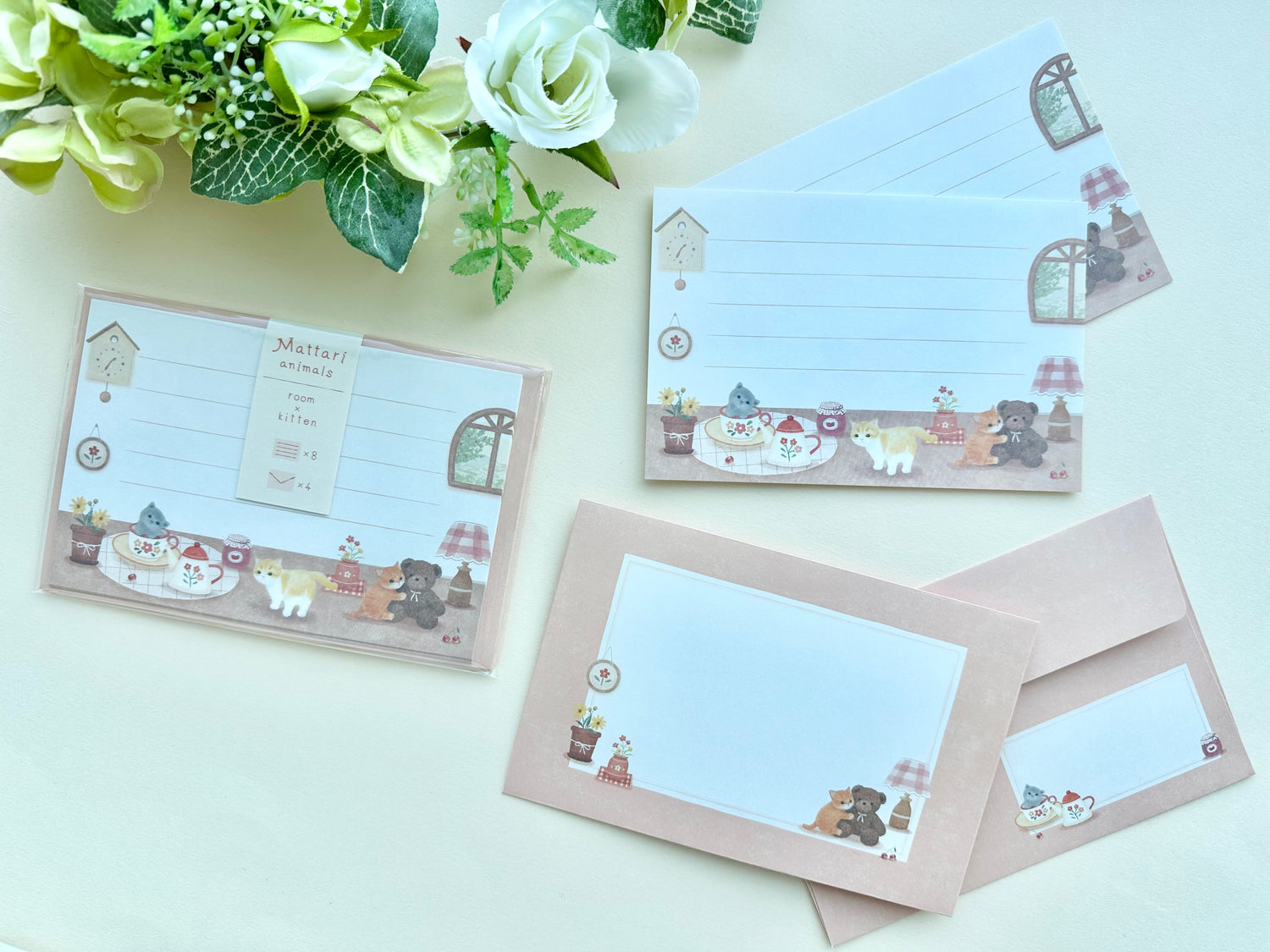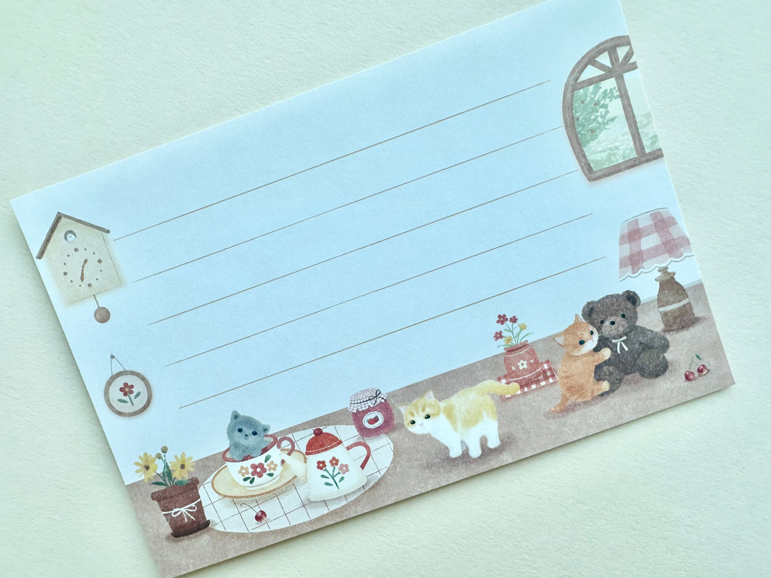Brevsett med kattunger som koser seg i et varmt og koselig rom.