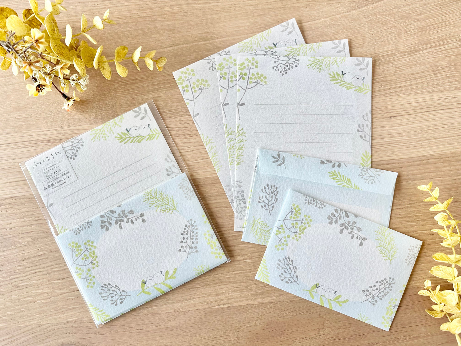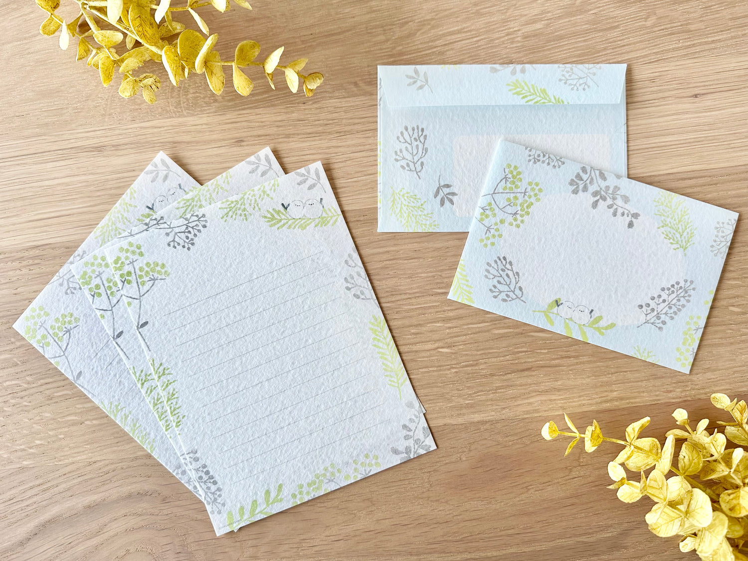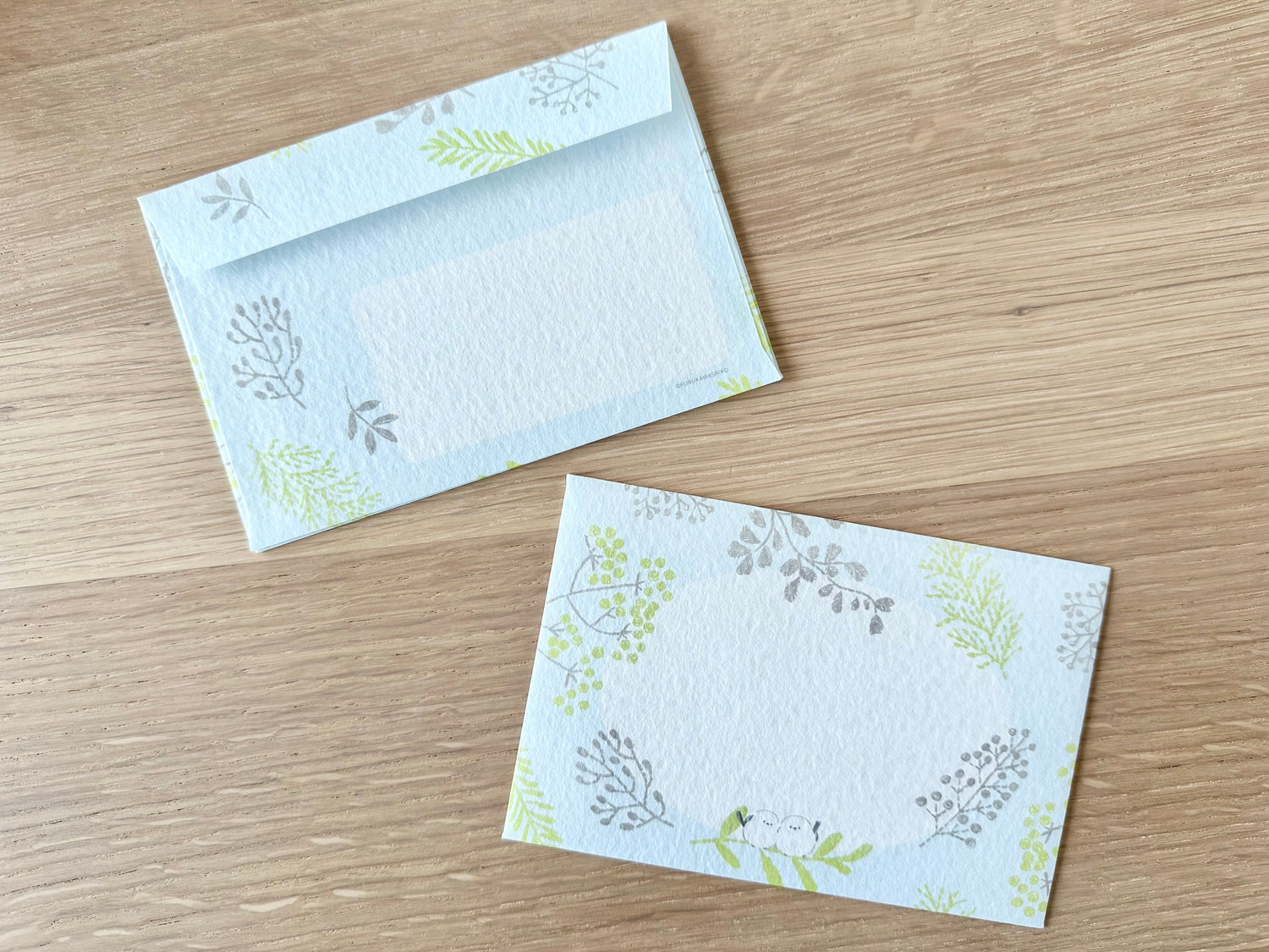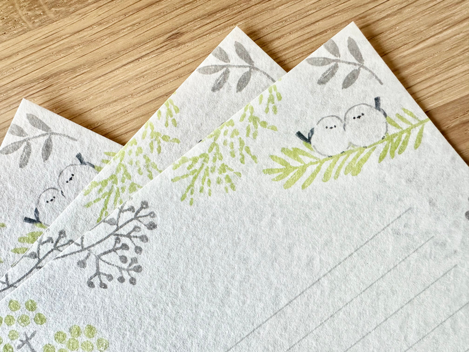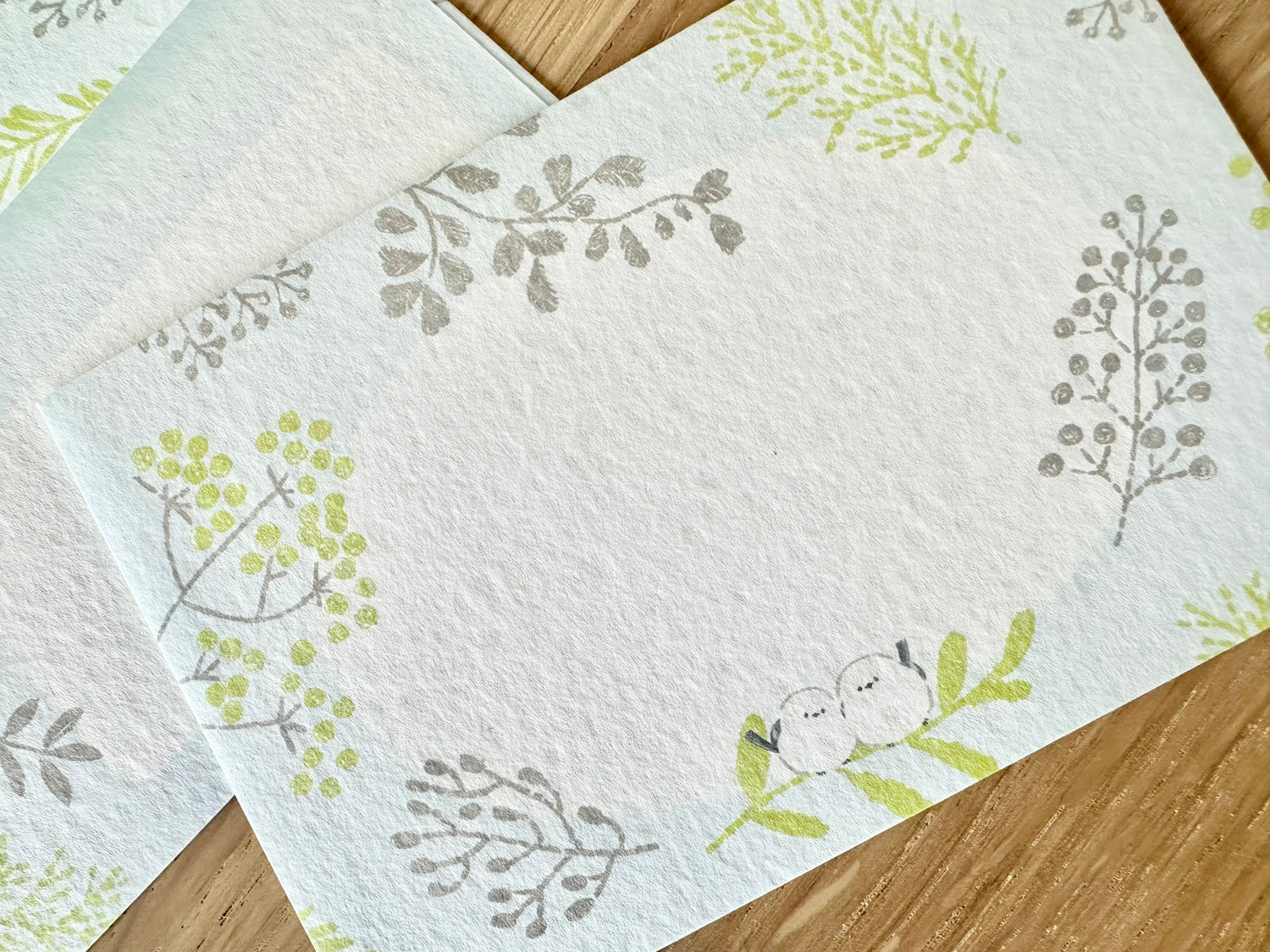 Brevsett med myke farger og søte småfugler.