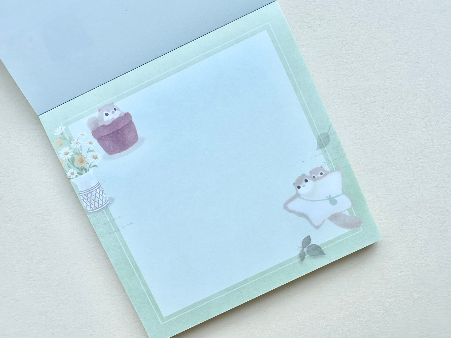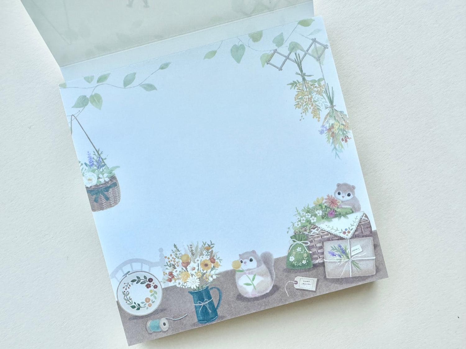Skriveblokk med flygeekorn som er omgitt av blomsterbuketter og kranser.