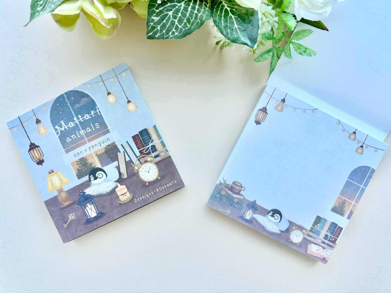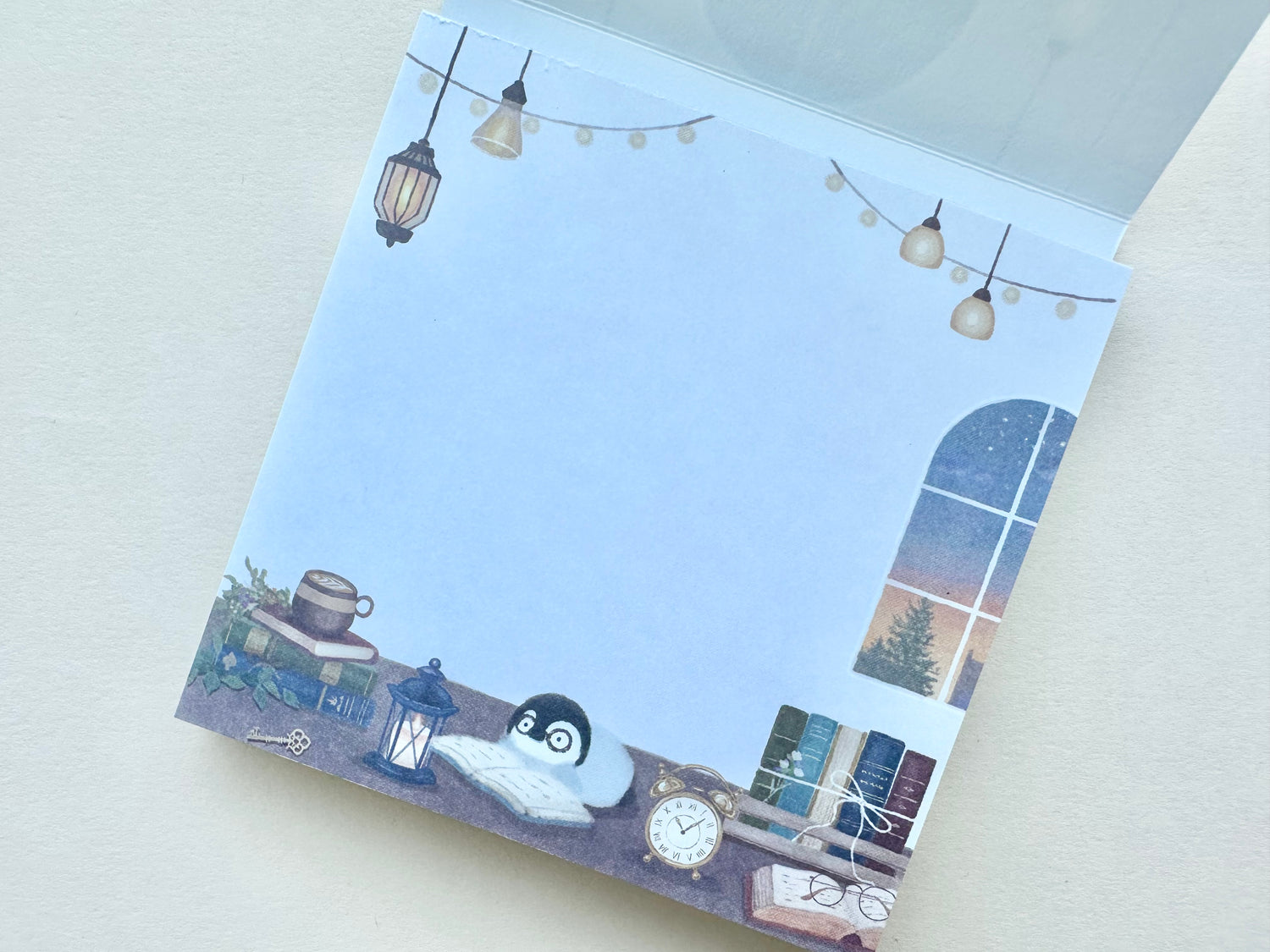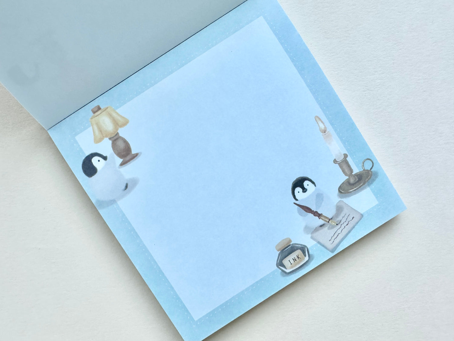Skriveblokk med pingviner som nyter kvelden med tente lys og en rolig atmosfære.